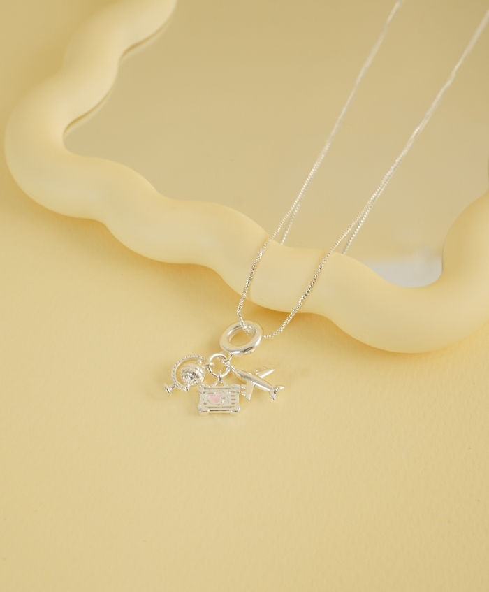 Cadena de aguja con dijes de avión, maletín y mapamundi. Fabricada en rodio y con una medida de 42cm y 4cm extensión..