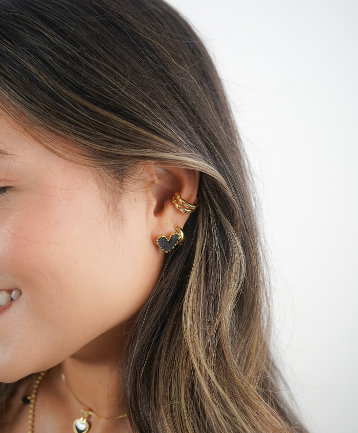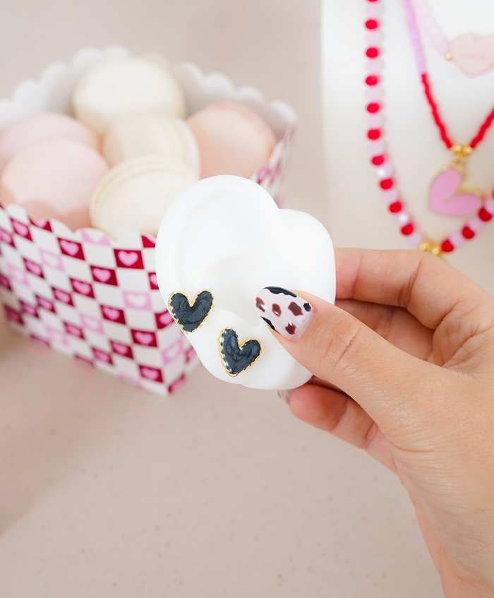 Aretes de corazón negro, fabricados en rodio..