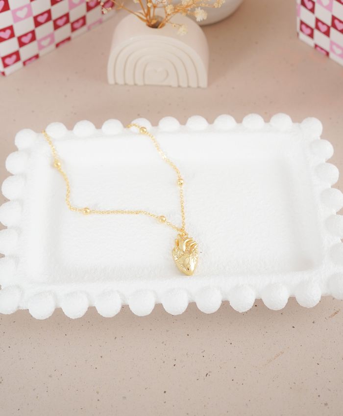 Cadena de eslabones mini con balines y hermoso dije de corazón anatómico, fabricado en rodio y con una medida de 43cm y 4cm de extensión