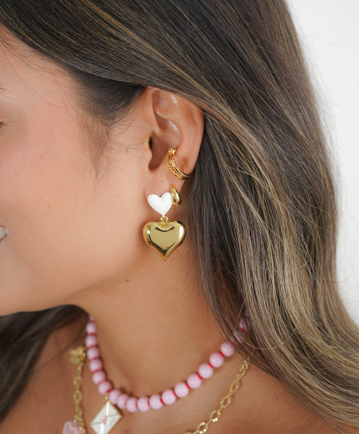 Aretes de corazón doble blanco y dorado, fabricados en rodio y con una medida de 3.5cm..