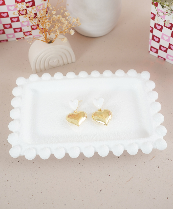 Aretes de corazón doble blanco y dorado, fabricados en rodio y con una medida de 3.5cm