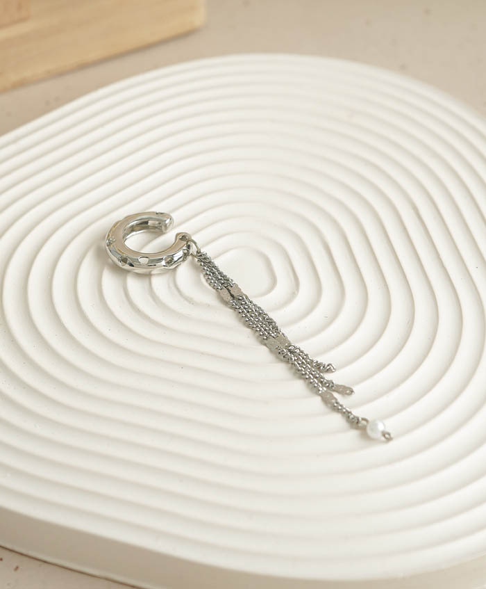 Earcuff plateado con huequitos y cadenas, fabricado en rodio y con una medida de 6/5.5/5cm