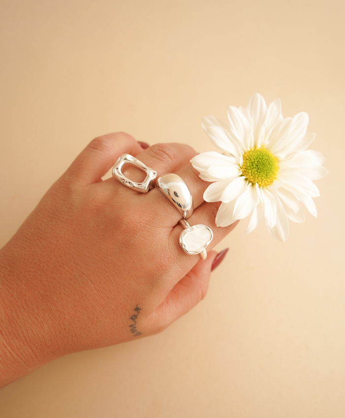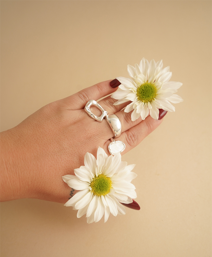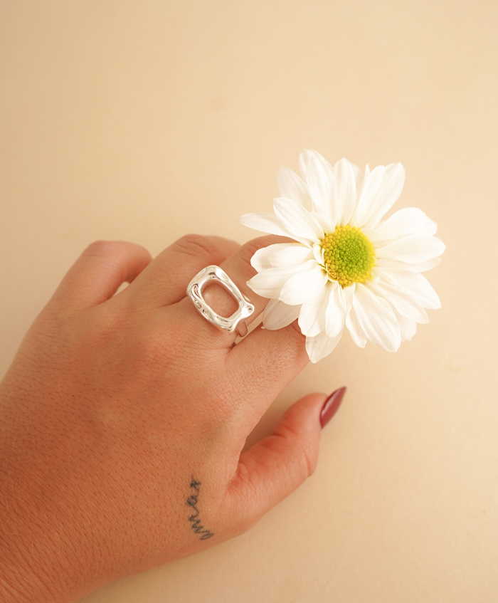 Anillo de forma abstracta en silueta, fabricado en baño de plata y ajustable