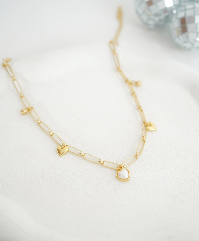 Tobillera de clip con dijes de corazón en perla y dorada, fabricada en rodio y con una medida de 25cm y 5cm de extensión..