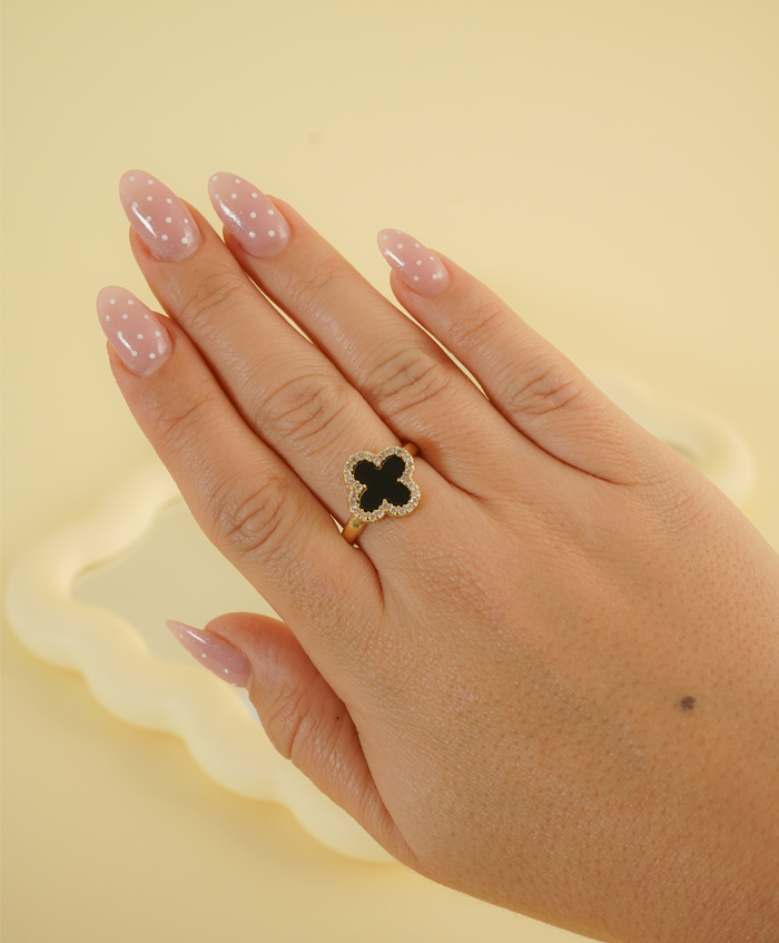 Anillo de trébol negro con circones, fabricado en rodio y ajustable..