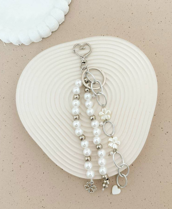 Llavero blanco con plateado, fabricado en aluminio y con broche de corazón..