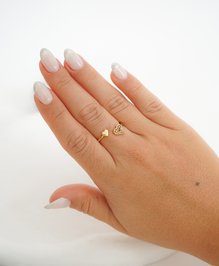Anillo de doble corazón con circones verdes, fabricado en rodio y ajustable..