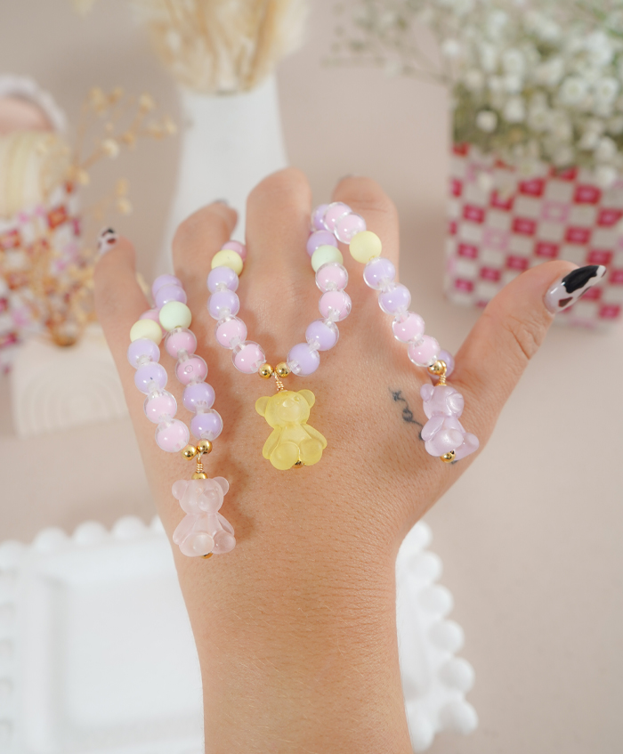 Choker con bolitas de colores y dije de ositos, fabricado en ábaco y ajustable