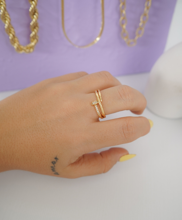 Anillo de clavo dorado con circones, fabricado en rodio y ajustable..