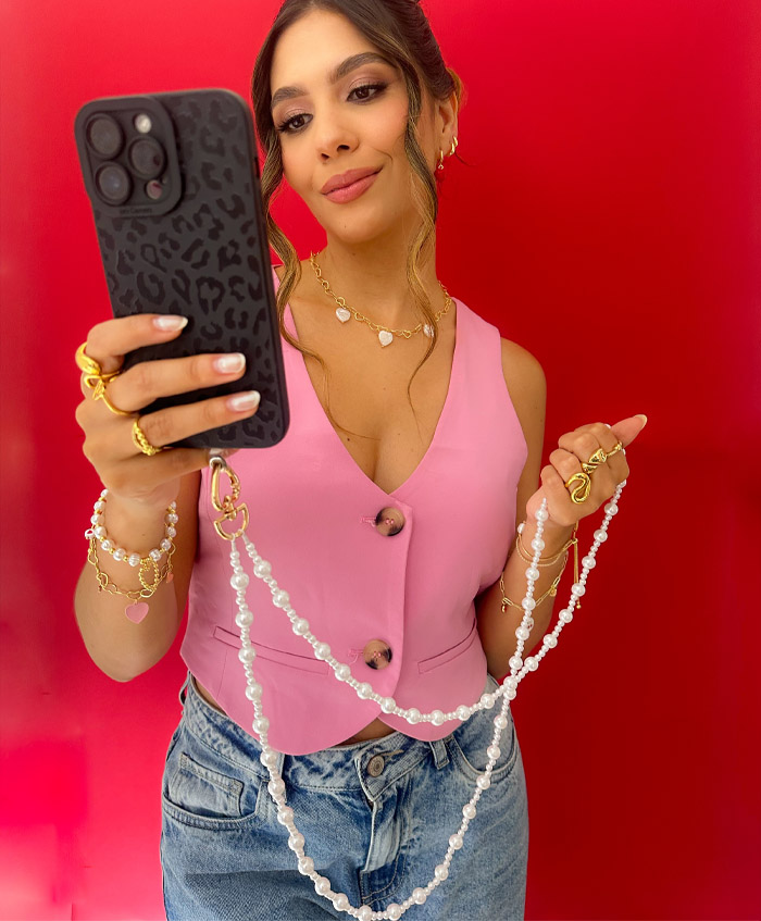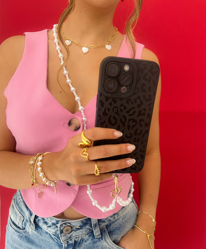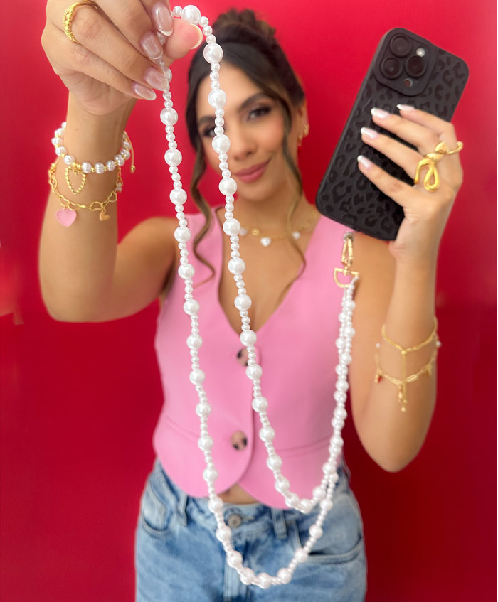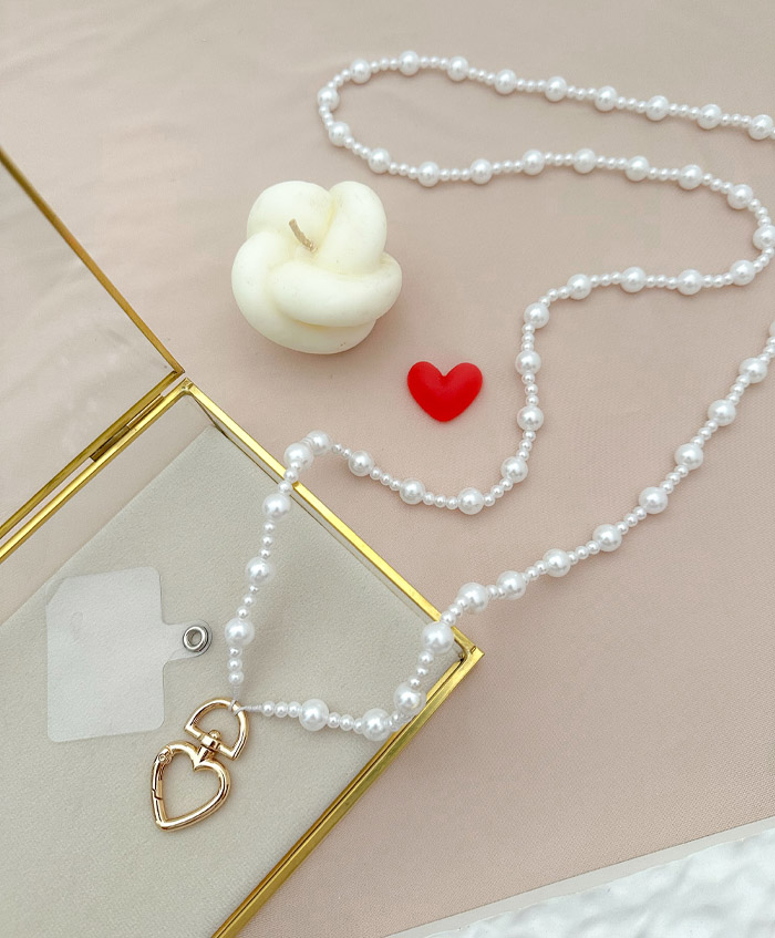 Strap para celular en perlas sintéticas, con broche dorado en forma de corazón, fabricado en aluminio y con una medida de 1.20metro