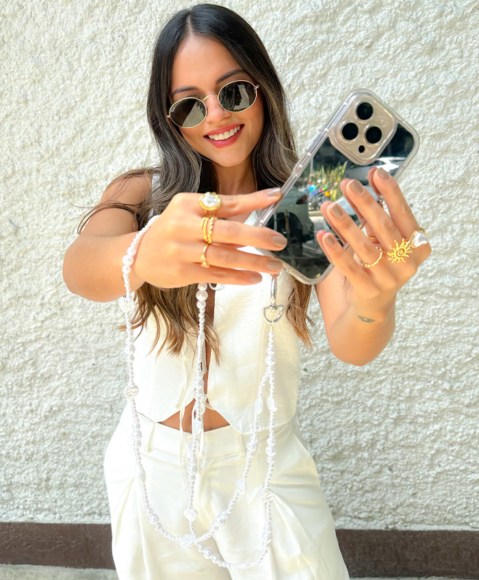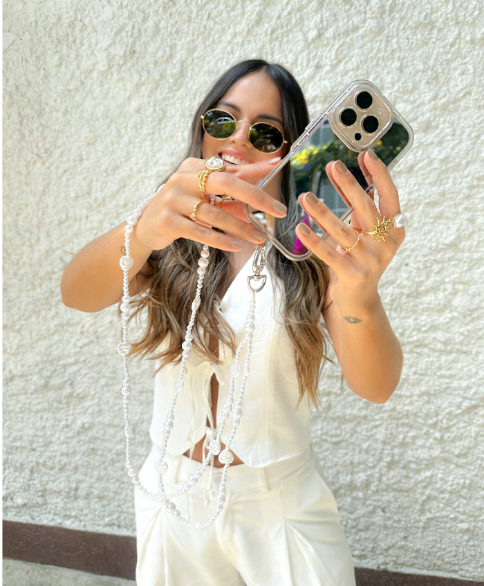 Strap para celular en perlas sintéticas y corazones, con broche plateado en forma de corazón, fabricado en aluminio y con una medida de 1.20metro. Incluye adaptador para estuches de celular..
