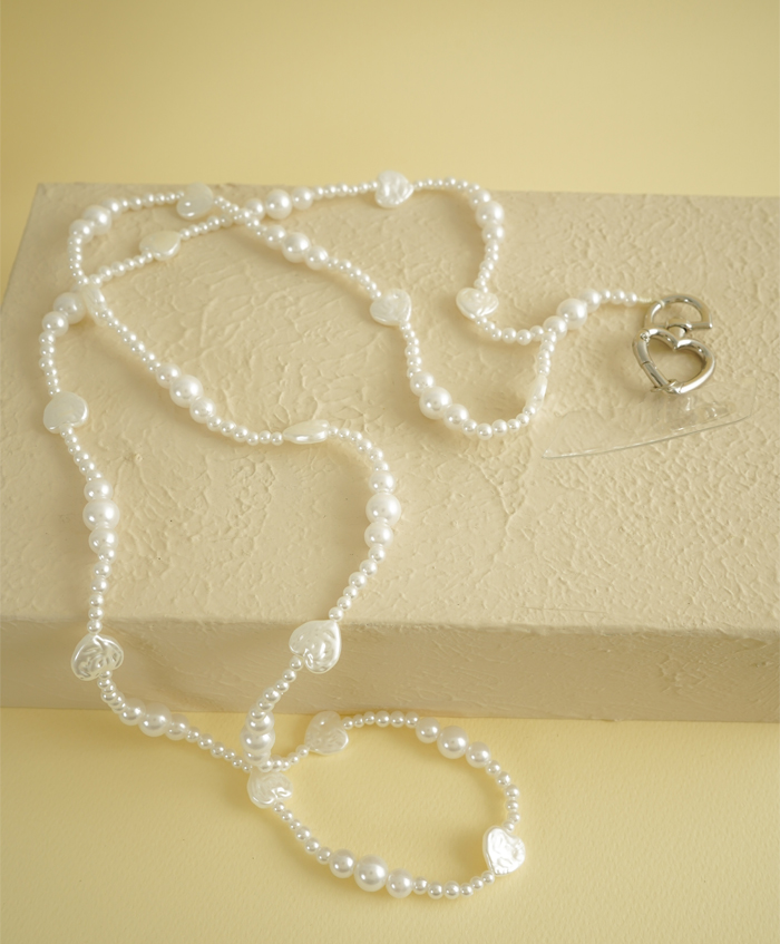 Strap para celular en perlas sintéticas y corazones, con broche plateado en forma de corazón, fabricado en aluminio y con una medida de 1.20metro. Incluye adaptador para estuches de celular