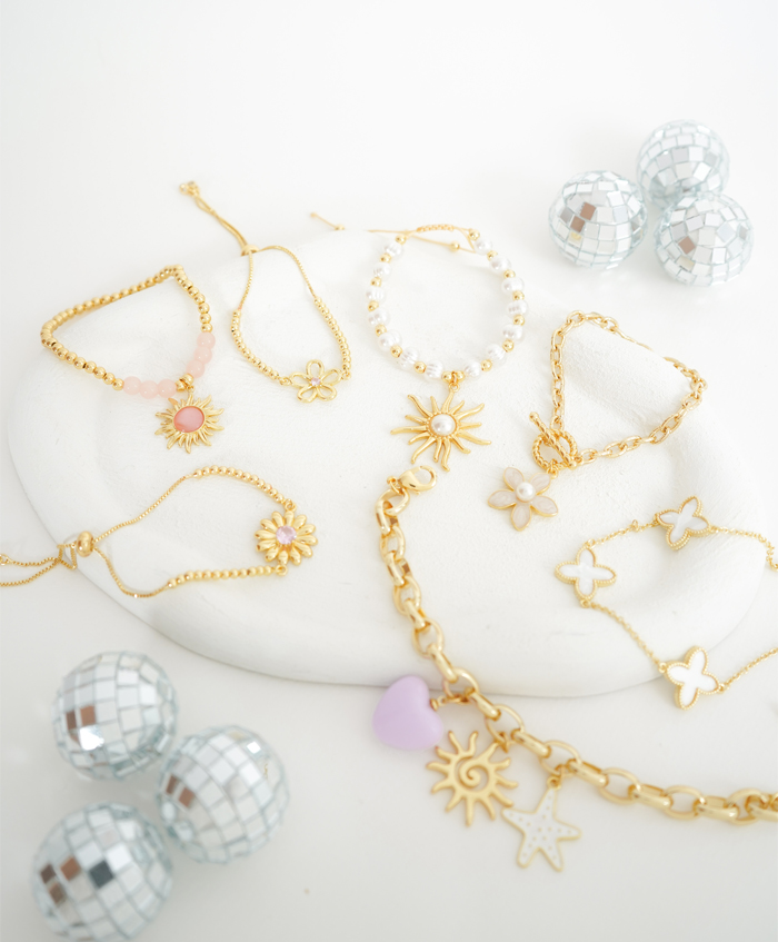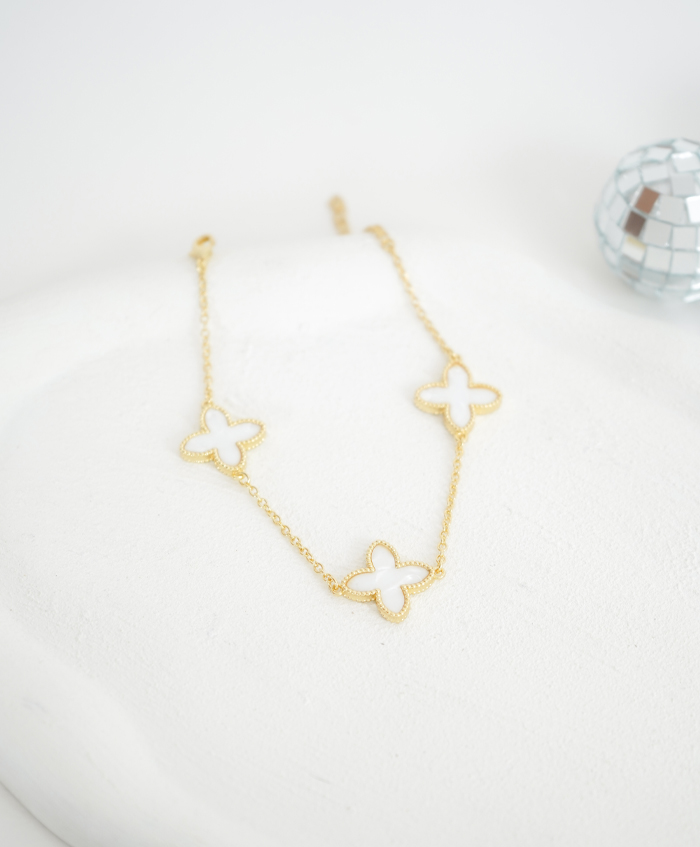 Pulsera de tréboles blancos, fabricada en rodio y con una medida de 19cm y 5cm de extensión