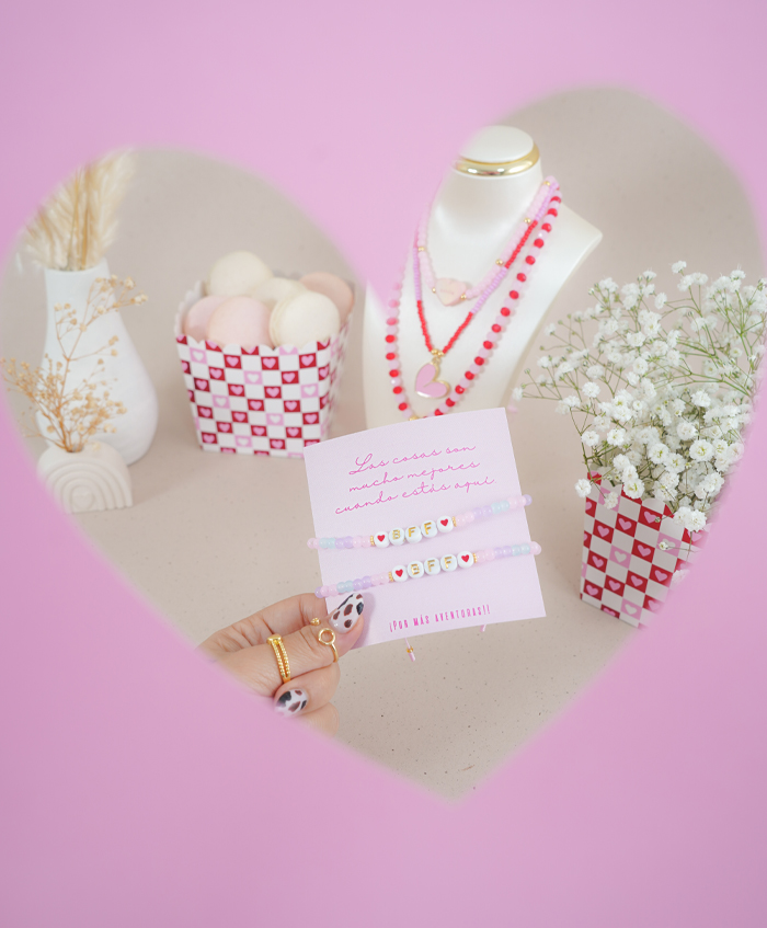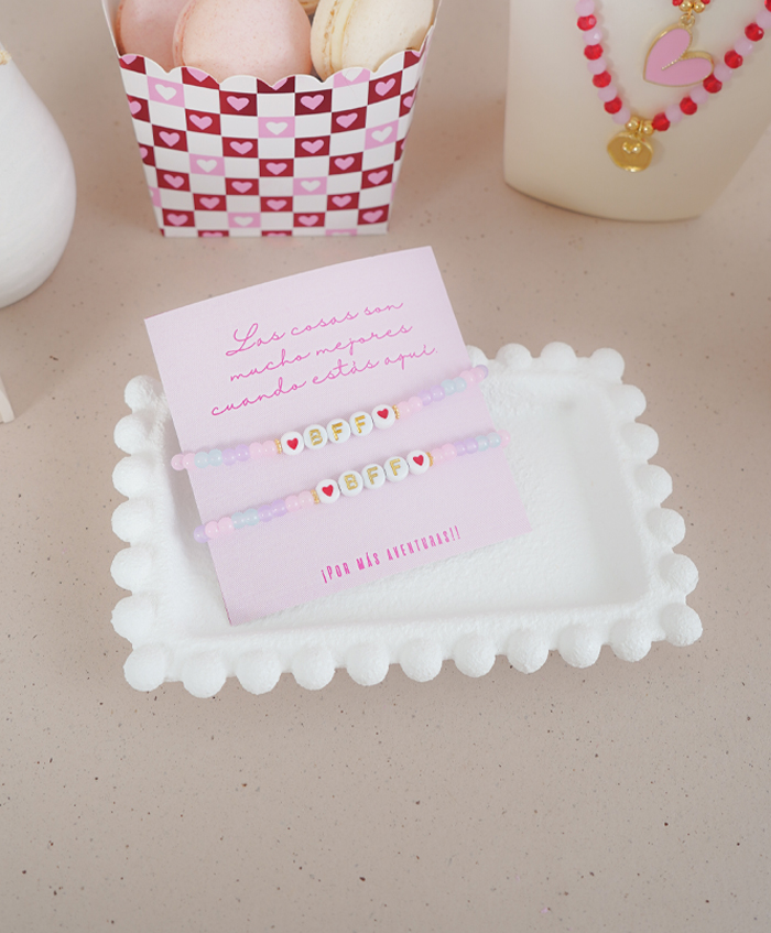 Pulseras de amigas en colores pasteles y con la palabra BFF, fabricadas en oro goldfilled y ábaco