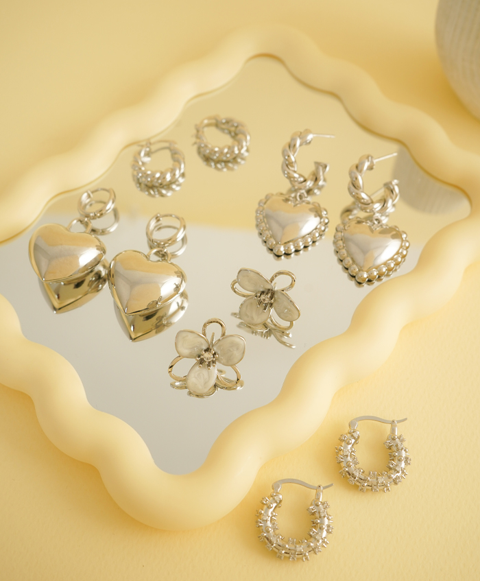 Aretes de flor plateadas y doradas en nácar, fabricadas en rodio..