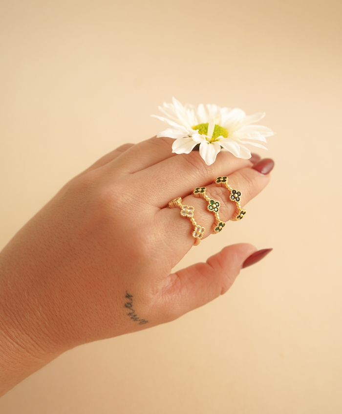 Anillos de trébol mini en circones, fabricados en rodio y ajustables..