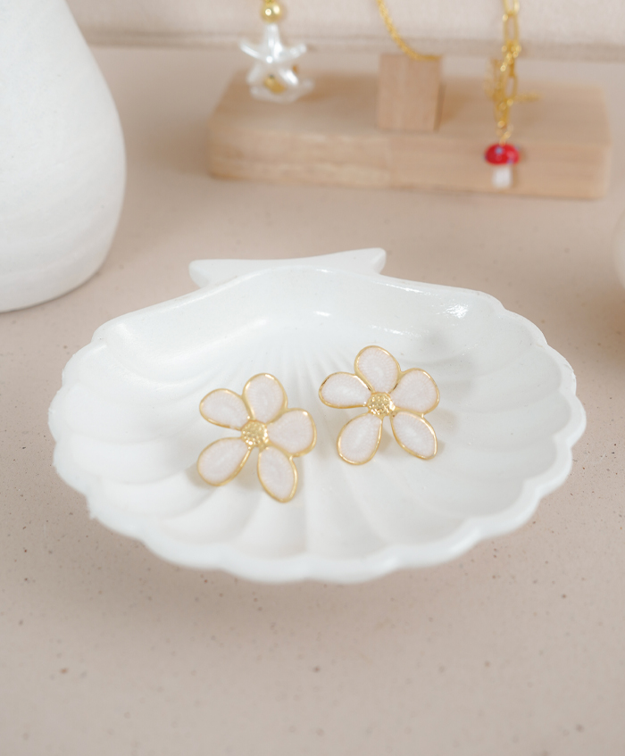 Aretes de flor blancas, fabricadas en rodio y con una medida de 2.5cm