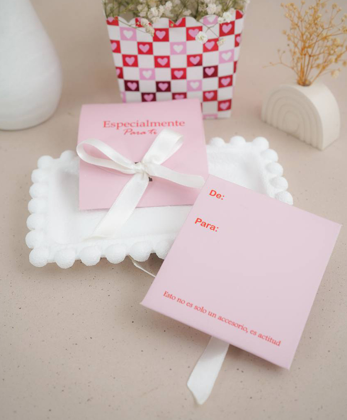 Empaque diseñado para enviar nuestros accesorios como regalito, largo 9cm y ancho 8cm..