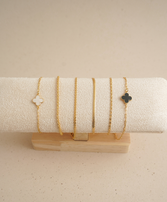 Pulsera eslabones trébol negro fabricada en oro laminado de 18k, con una medida de 18cm y 2cm de extensión. Cuenta con una garantía de 2 años por defecto de fabrica o cambio de color. Conserva tu factura para cambios y garantías