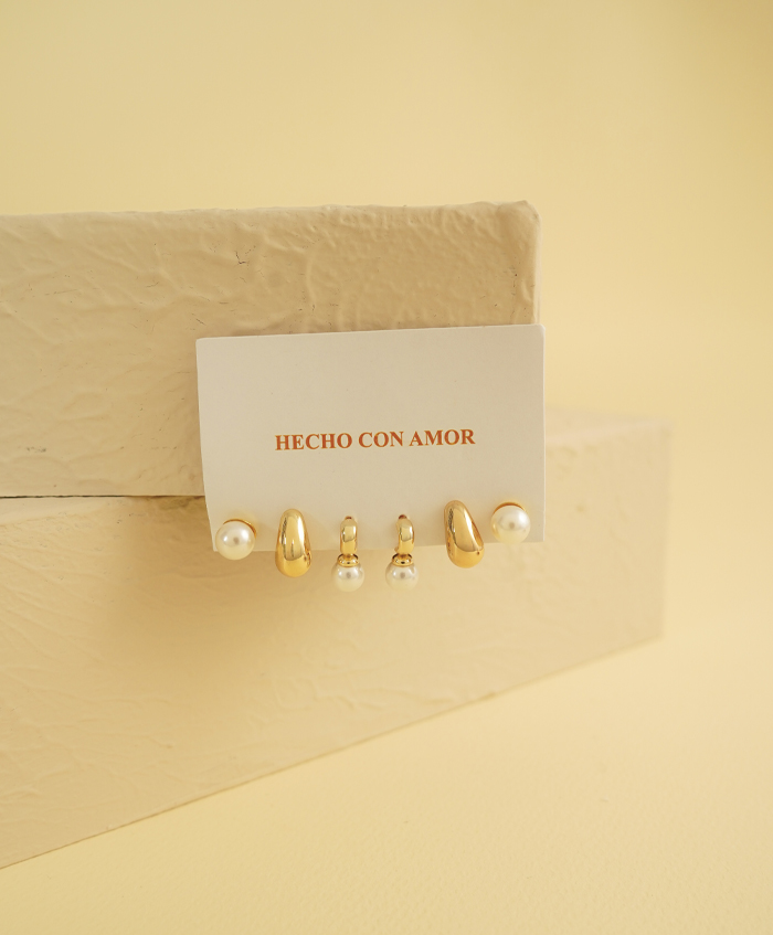 Set de 3 aretes en gota y de perla sintética, fabricadas en rodio