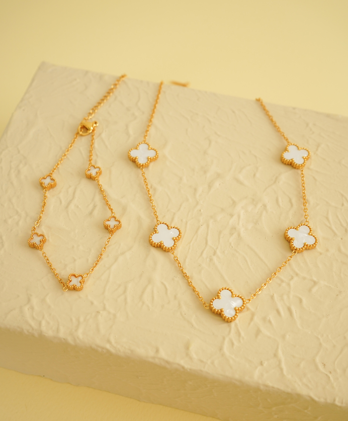 Pulsera de trébol blanco mini, fabricada en acero inoxidable y con una medida de 18cm y 5cm de extensión