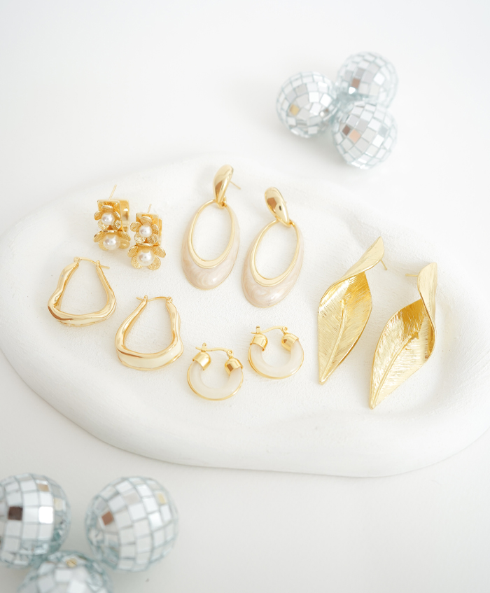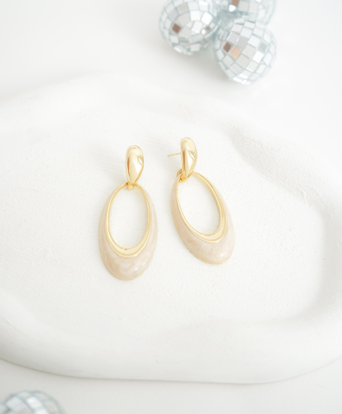 Aretes ovaladas en silueta con borde beige, fabricadas en rodio y con una medida de 6.5cm..