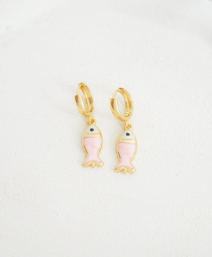 Aretes de pez rosa, fabricados en rodio y con una medida de 3.5cm..