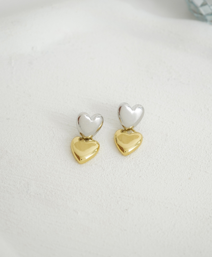 Aretes de corazón doble bicolor, fabricadas en rodio y con una medida de 2.5cm..