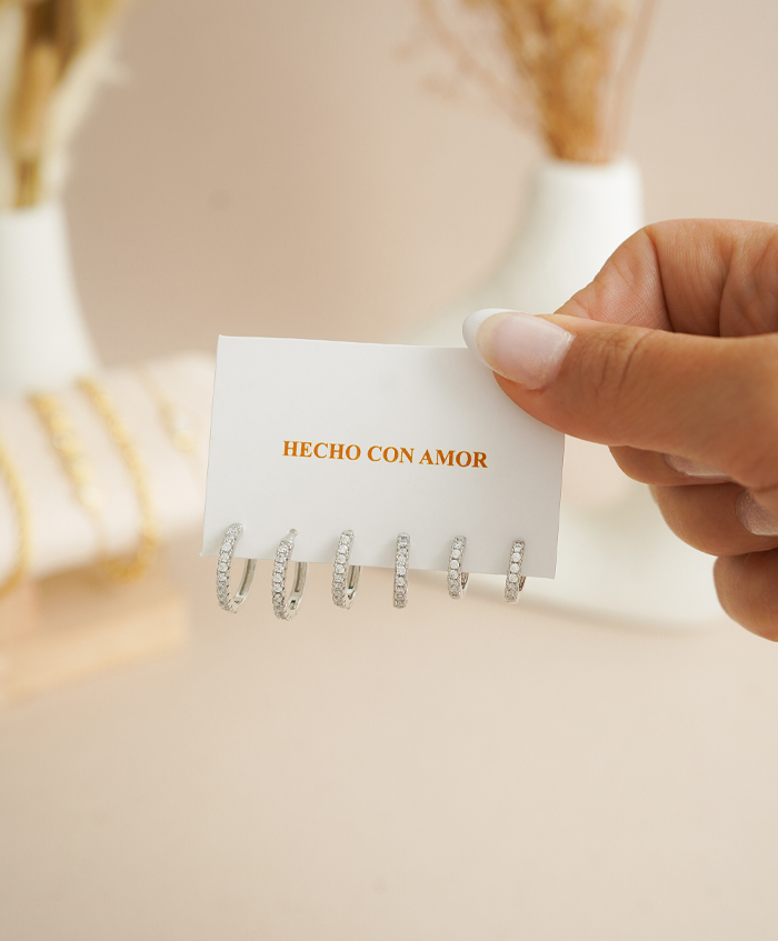 Set de candongas plateadas con circones, fabricadas en rodio y con una medida de 1.5cm/1.3cm/1cm