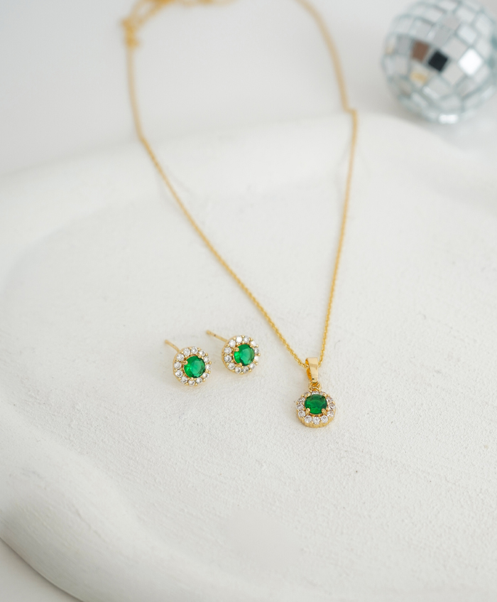 Set de aretes y collar con circones blancos y verdes, fabricado en rodio y con una medida de 42cm y 4cm de extensión..