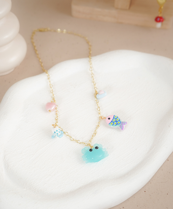 Cadena de corazones en silueta con dijes marinos azules, fabricado en rodio y con una medida de 44cm..