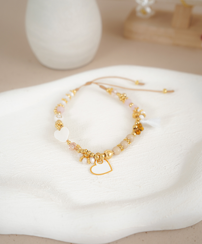 Tobillera beige con dijes blancos, fabricada en oro goldfilled..