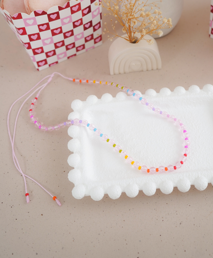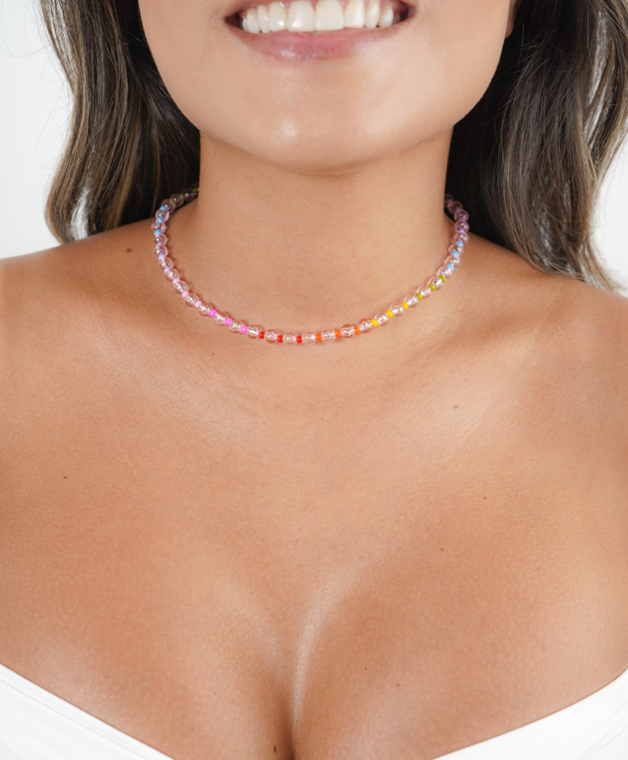Choker de perlitas transparentes rosa con chaquiras de colores, ajustable..