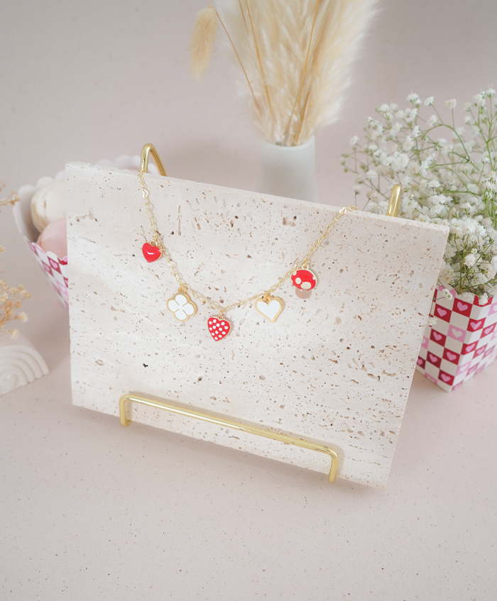 Collar en cadena de corazones con dijes rojos y blancos, fabricado en rodio y con una medida de 44cm, es ajustable por el tipo de cadena..