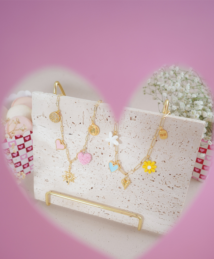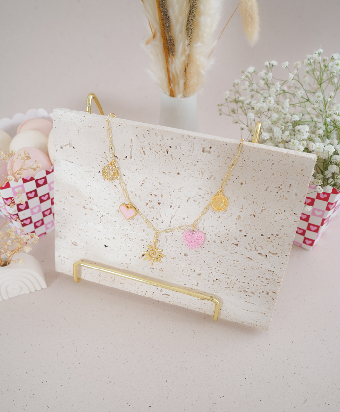 Collar en cadena de clip dorado y dijes rosas, fabricado en rodio y con una medida de 43cm y 5cm de extensión..