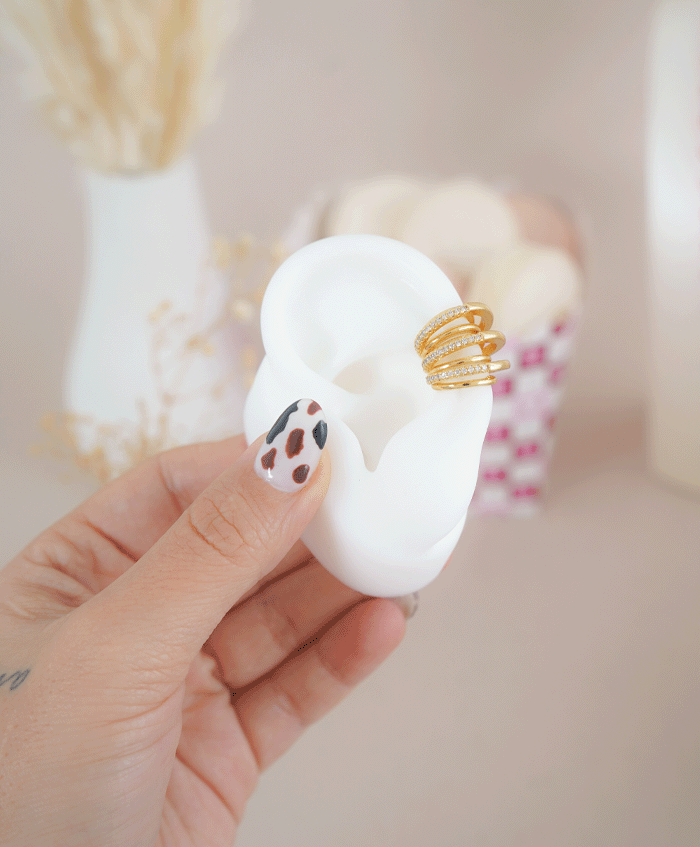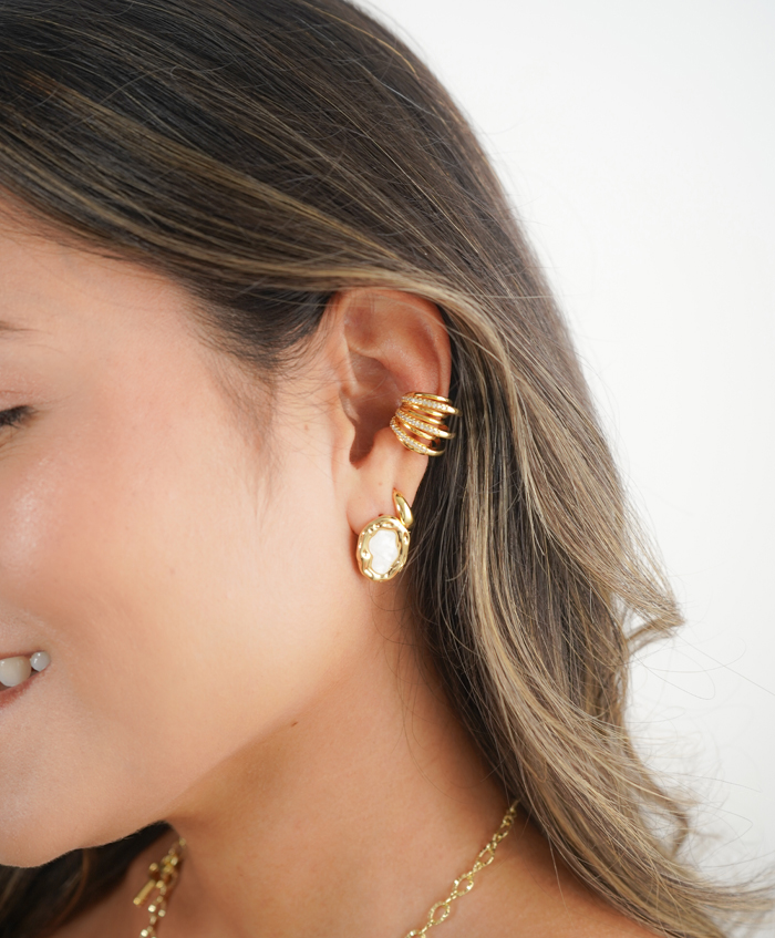 Earcuff triple de circones y triple de lineas doradas, fabricado en rodio..