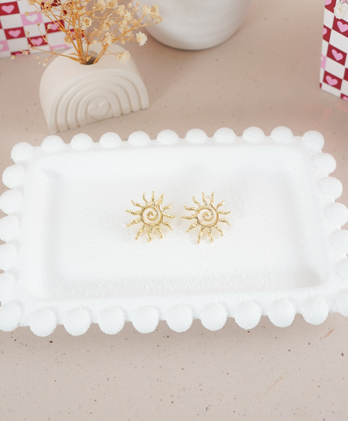 Aretes de sol dorado en silueta, fabricados en rodio y con una medida de 2.5cm..