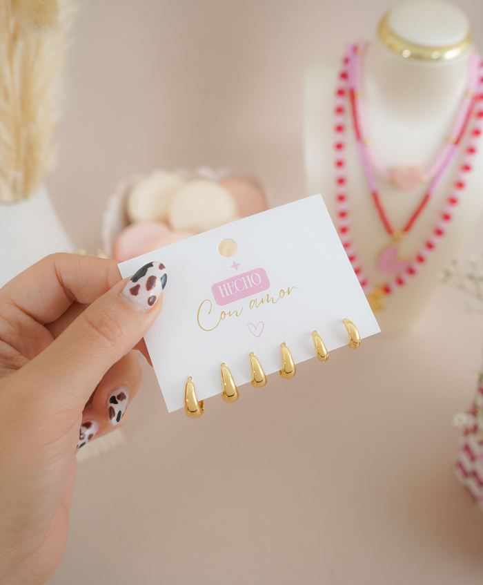 Set de 3 candongas en forma de gota doradas, fabricadas en rodio y con medida de 1.3/1.1cm y 9mm