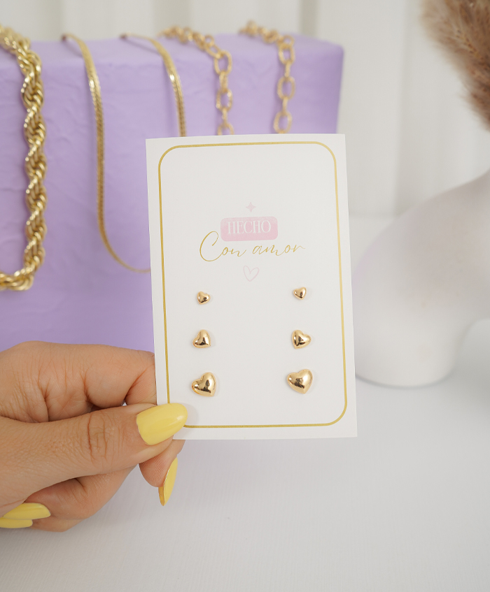 Set de 3 aretes de corazón dorada, fabricados en rodio..