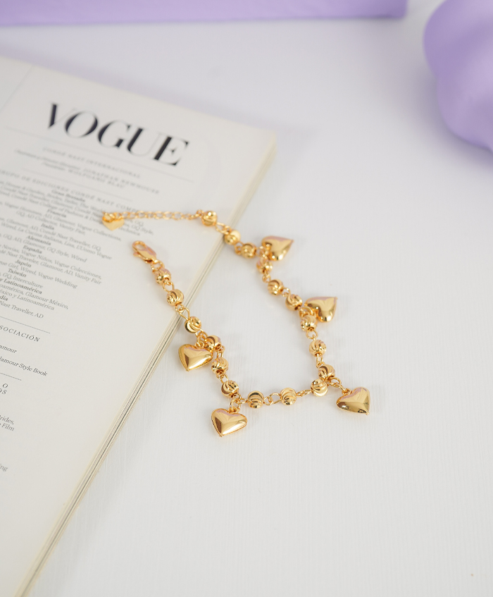 Pulsera en cadena militar con hermosos detalles y dijes de corazón pequeño dorados, fabricada en rodio y con una medida de 20cm y 3cm de extensión..