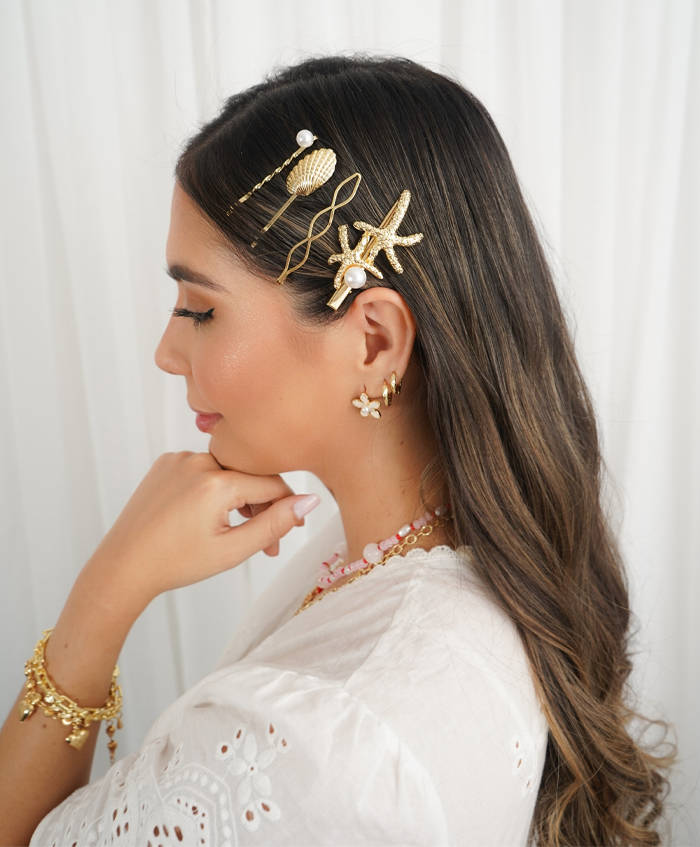 Set de 4 hebillas con conchas, perlas y estrellas de mar, fabricadas en rodio