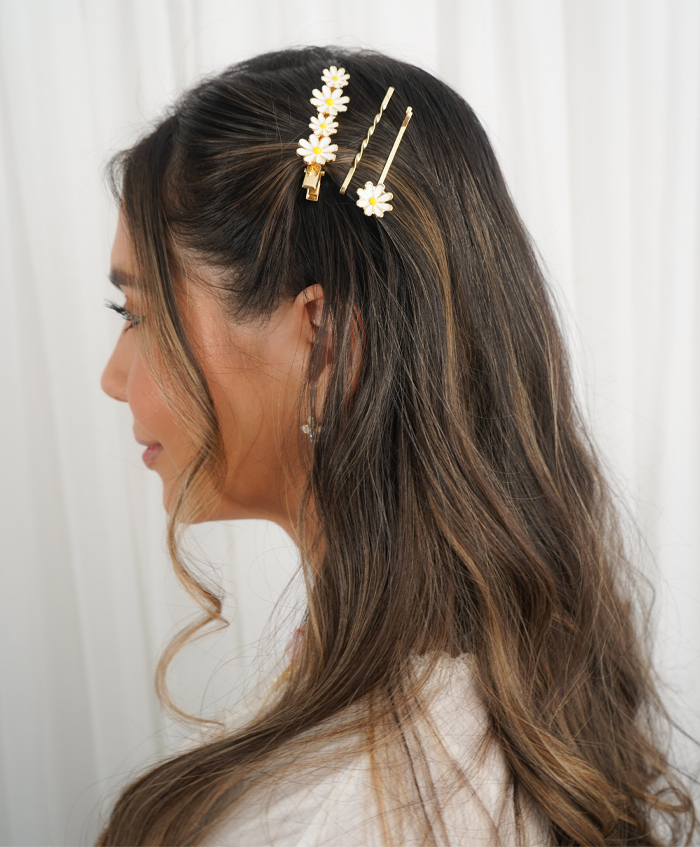 Set de 3 hebillas de margarita, fabricadas en rodio..