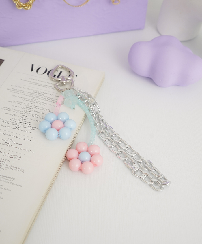 Strap para celular con cadena y dijes de flor en ábaco con broche plateado en forma de corazón, fabricado en aluminio y con una medida de 32cm. Incluye adaptador para estuches de celular
