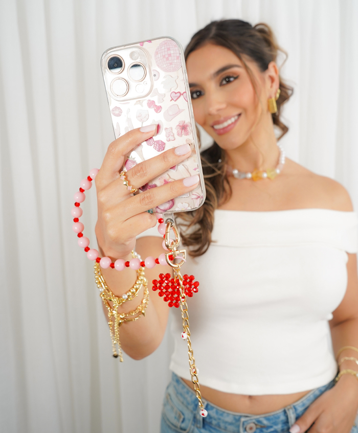 Strap para celular con cadena, ábacos y dije de corazón en murano con broche dorado en forma de corazón, fabricado en aluminio y con una medida de 32cm. Incluye adaptador para estuches de celular