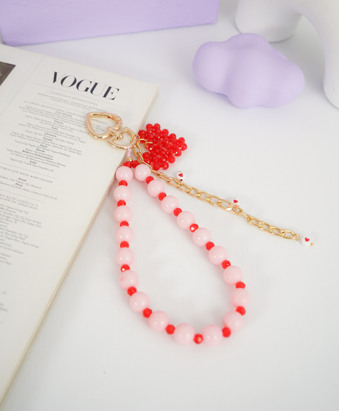 Strap para celular con cadena, ábacos y dije de corazón en murano con broche dorado en forma de corazón, fabricado en aluminio y con una medida de 32cm. Incluye adaptador para estuches de celular..
