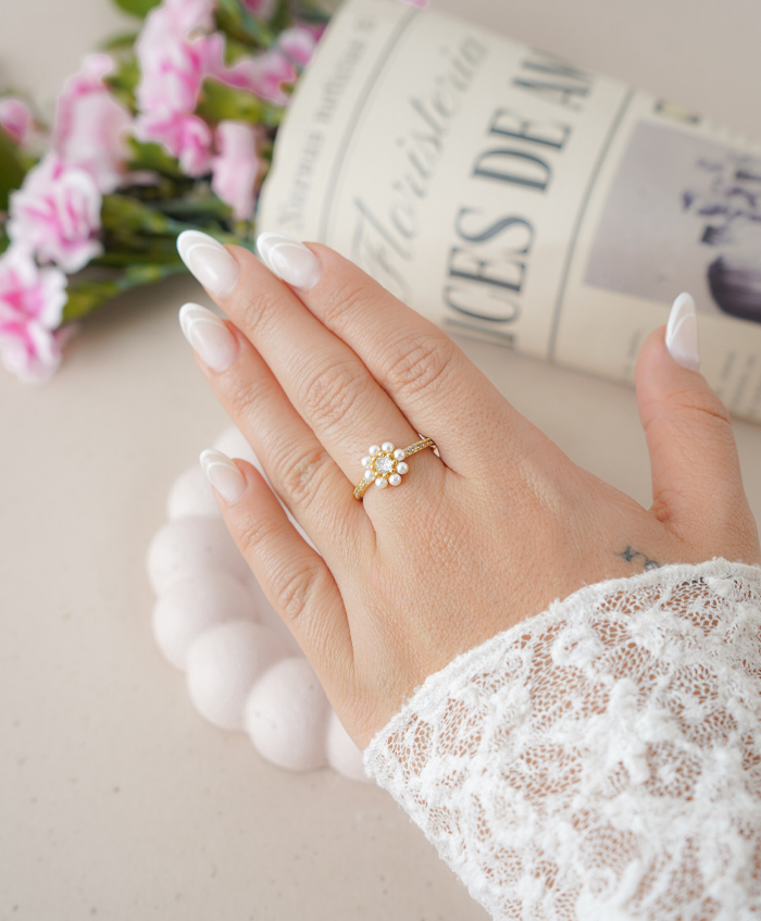 Anillo en forma de flor con perlas y circones, fabricado en rodio y ajustable