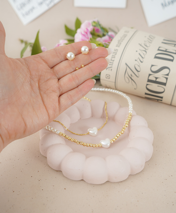 Set de dos aretes de perlas en bolitas y balines mini con dos collares uno de perlas con balines y dije de corazón en nácar y otra de cadenita con dije de corazón en nácar, fabricados en rodio y con una medida 40cm y 47cm