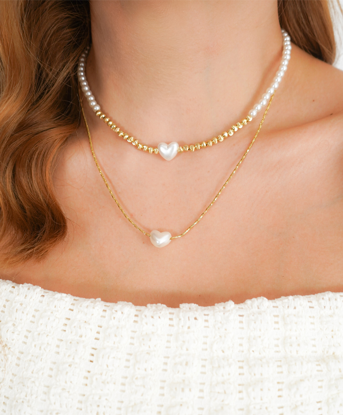 Set de dos aretes de perlas en bolitas y balines mini con dos collares uno de perlas con balines y dije de corazón en nácar y otra de cadenita con dije de corazón en nácar, fabricados en rodio y con una medida 40cm y 47cm..