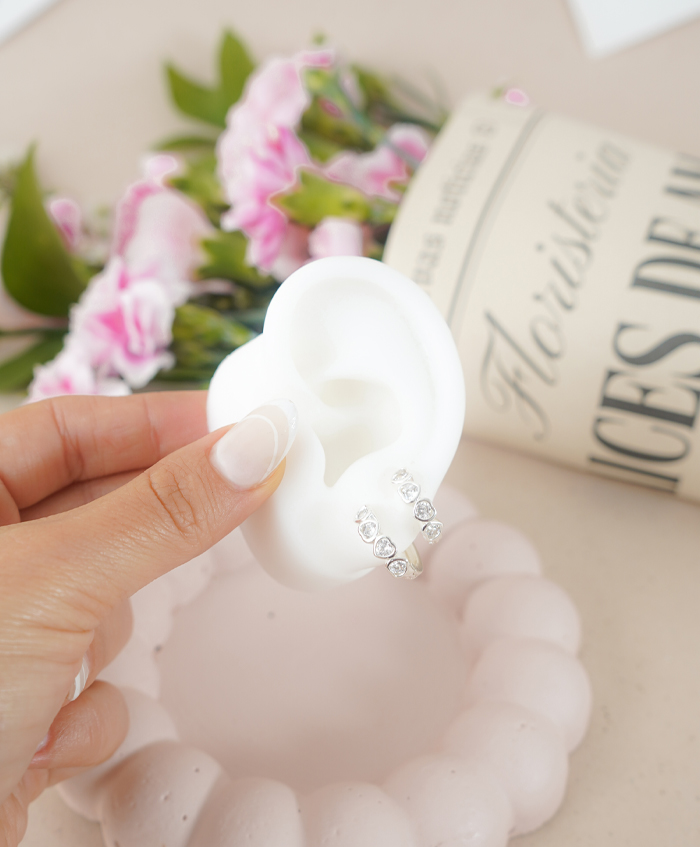 Candongas plateadas con circones en forma de corazón, fabricada en rodio y con una medida de 1.5cm