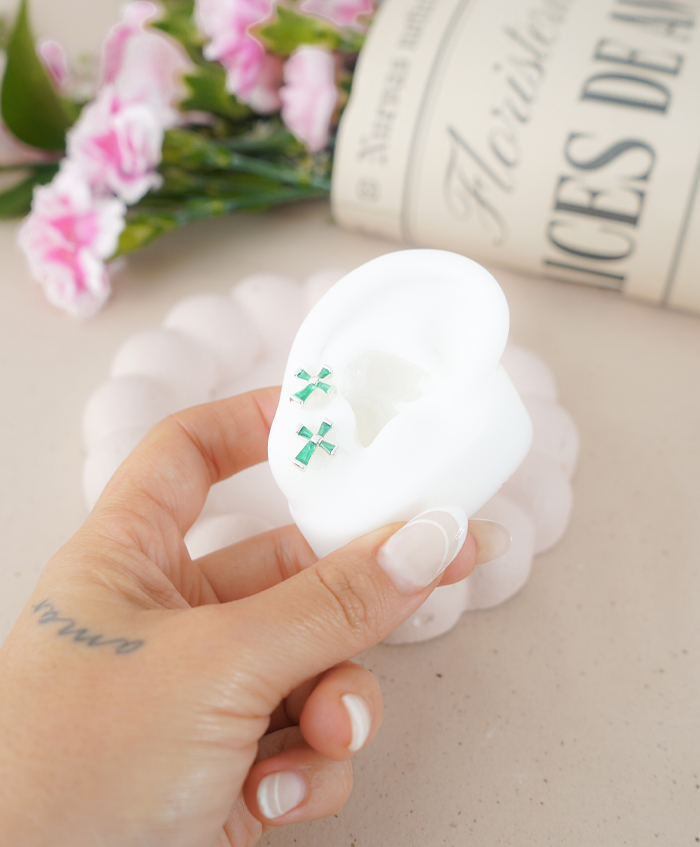 Aretes de cruz plateadas con circones verdes, fabricados en rodio y con una medida de 1.1cm..